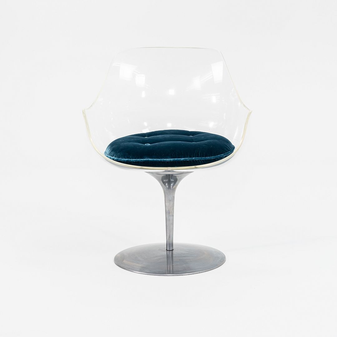 This is a Champagne Chair, designed by Estelle & Erwine Laverne in 1957. It was made by Formes Nouvelles. This piece was produced in the early 1960s as part of their Invisible series. It features a cast-acrylic perspex shell, and has a tulip-shaped revolving base. It has a cushion that is removable, currently upholstered in a Peacock Blue silk-velvet. It is properly stamped underneath, “Made in Italy, Champagne Chair Laverne, Formes Nouvelles”.