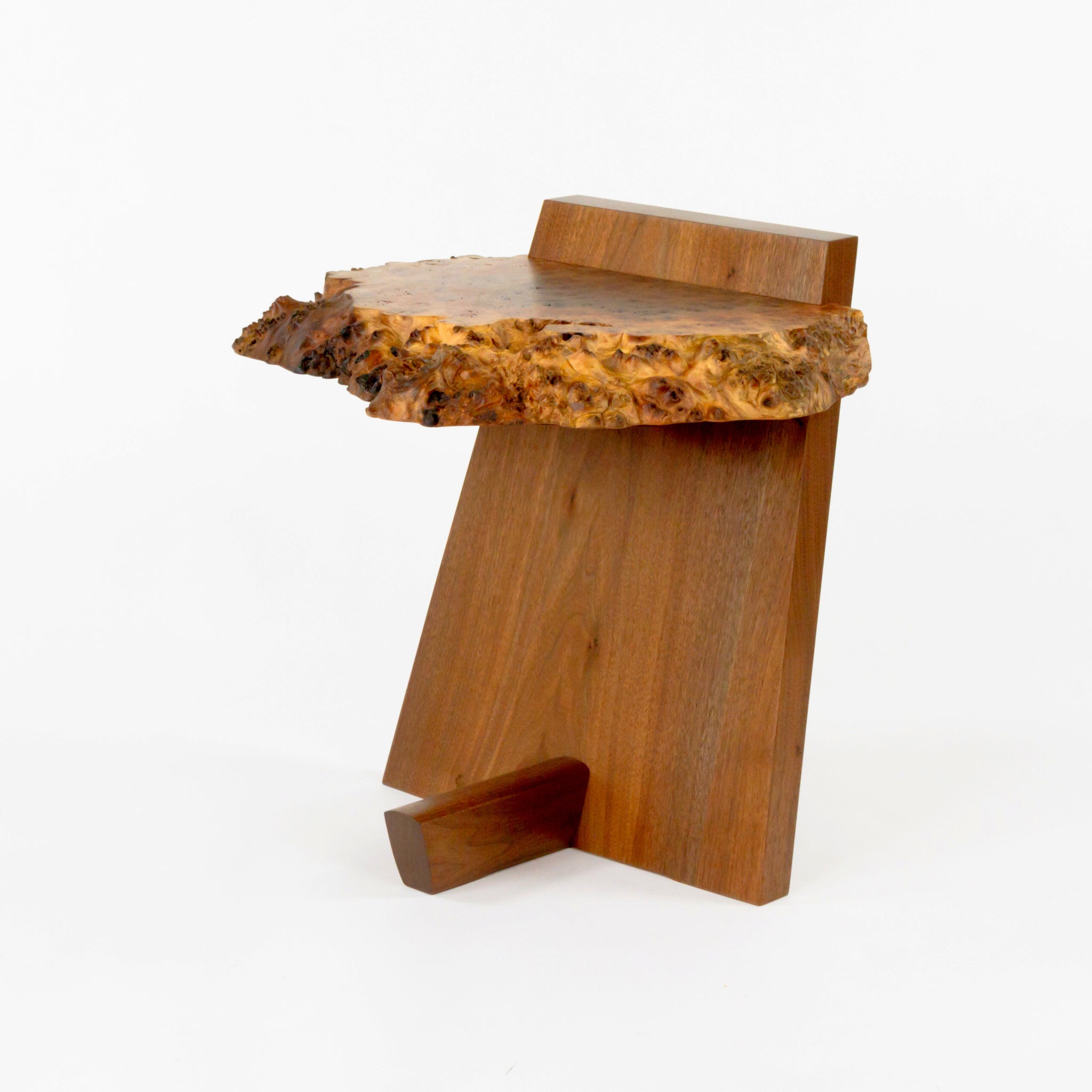 Listed for sale is a very special Mira Nakashima Kevin end table, produced at the renowned Nakashima Woodworking Studio in New Hope, Pennsylvania. This example was crafted from Claro Walnut burl for the top and figured black walnut on the base. It was designed by Mira Nakashima. The table is a stunning example of the Kevin side table design. The burl is inset within the vertical slab and cantilevers, supported without the need for a walnut spindle as some others have.